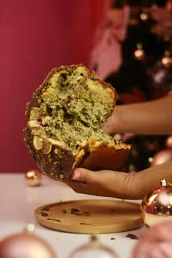 Um delicioso chocotone recheado com um creme de pistache crocante, perfeito para os amantes de pistache. (Aprox 1kg)