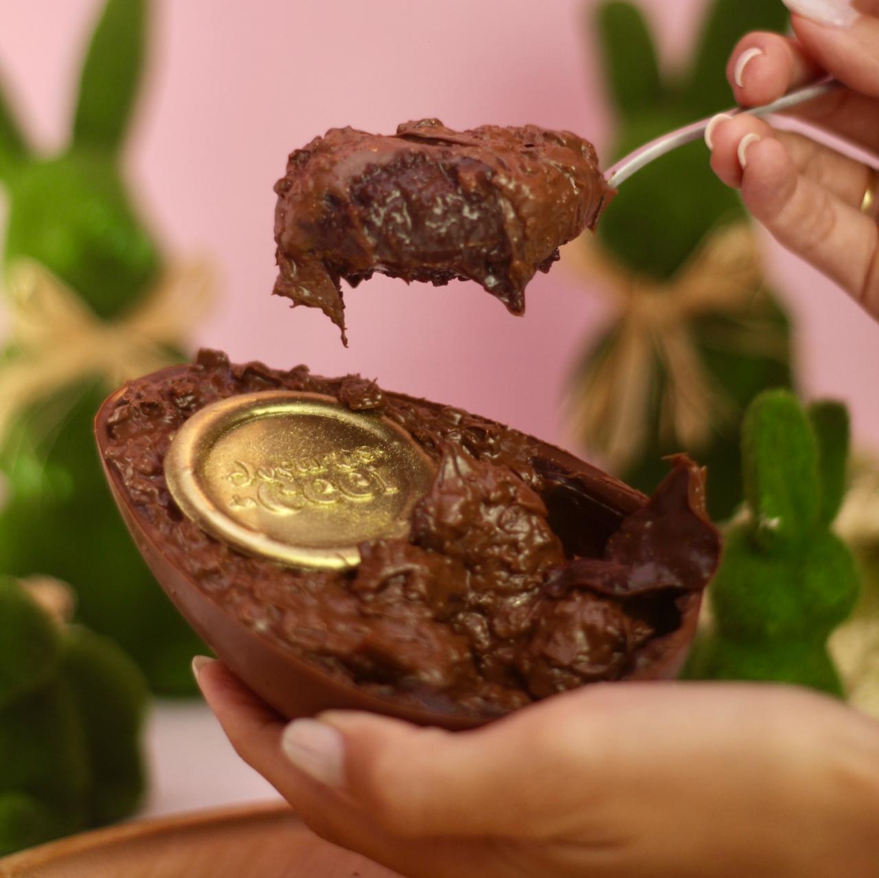 O nosso famoso bolo crocante agora no formato de ovo de páscoa, recheado com brigadeiro ao leite, massa de bolo bem molhadinha e uma nutella crocante por cima. Aprox 320g