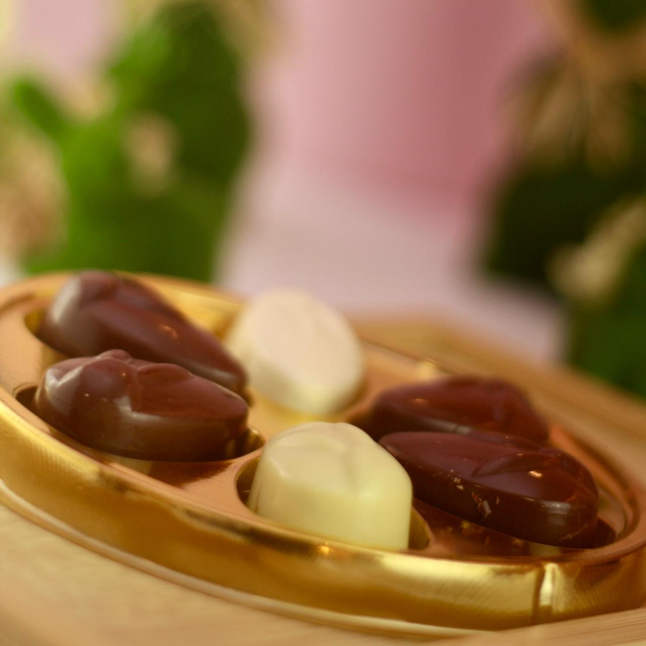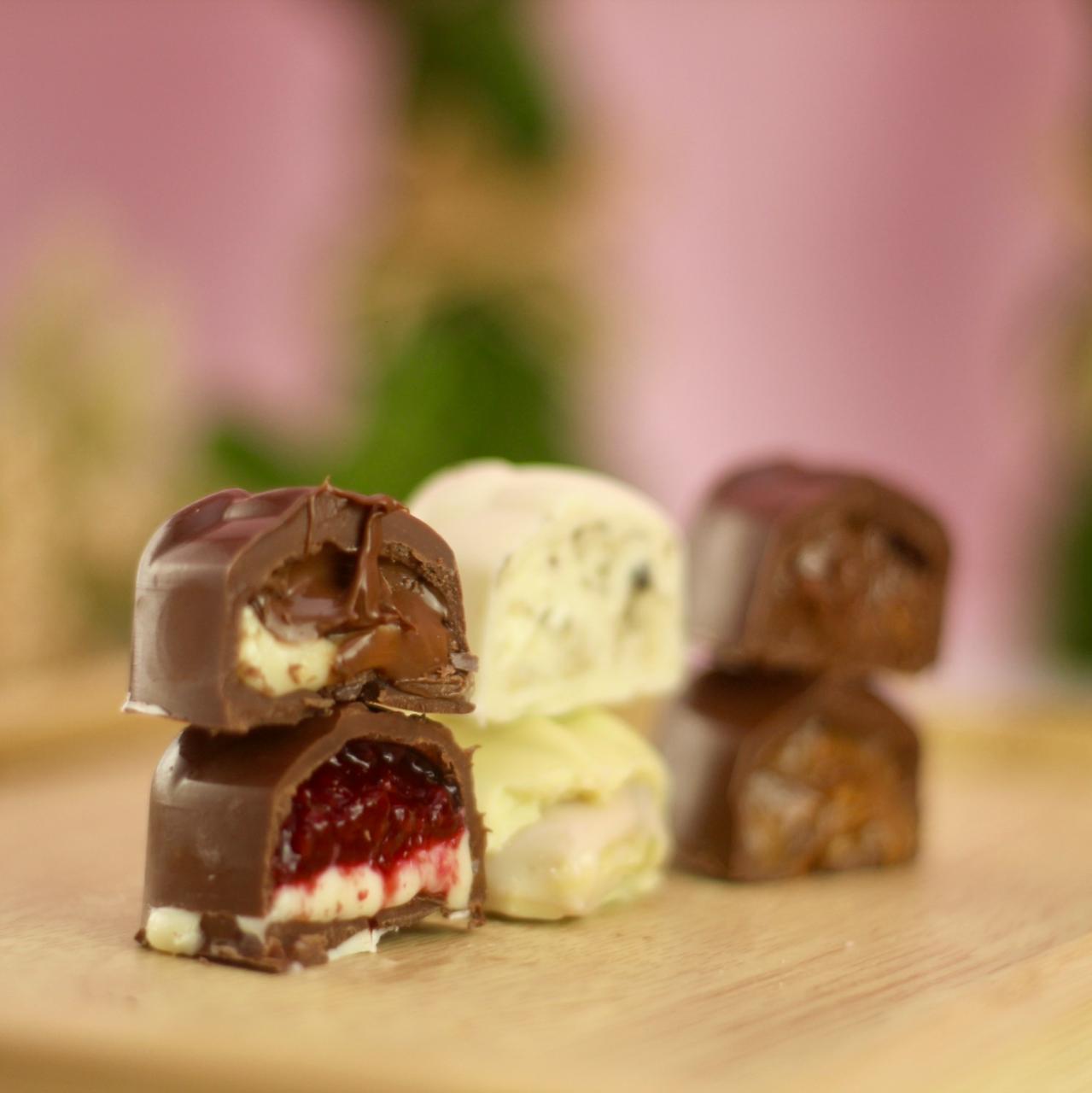 Uma caixa linda com 6 opções de bombons trufados: Pistache, Caramelo Crocante, Franuí, Ninho c Nutella, Laka Oreo e Nutella Crocante.